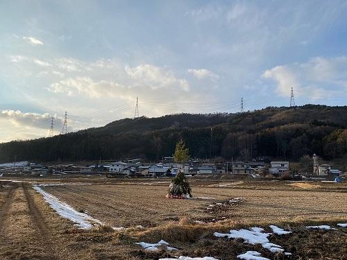 昔は大小2つ作って、間に渡した縄にダルマを通していましたが、今は1つ。田んぼの真ん中で、明日(8日)昼過ぎの点火をじっと待っています。
