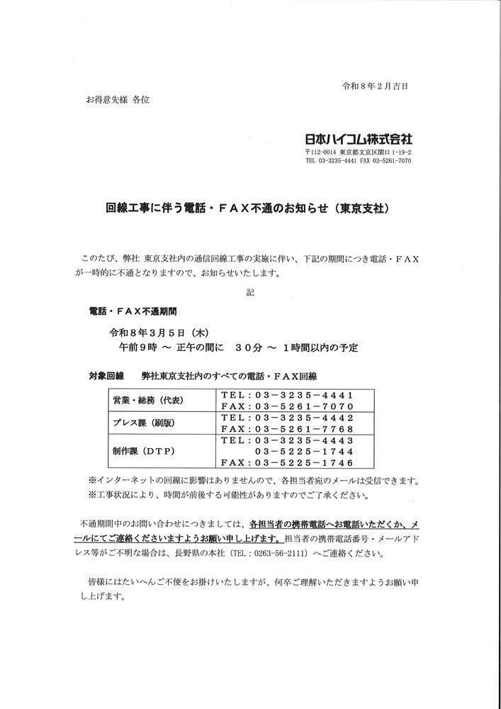 回線工事に伴う電話・FAX不通のお知らせ(東京支社)